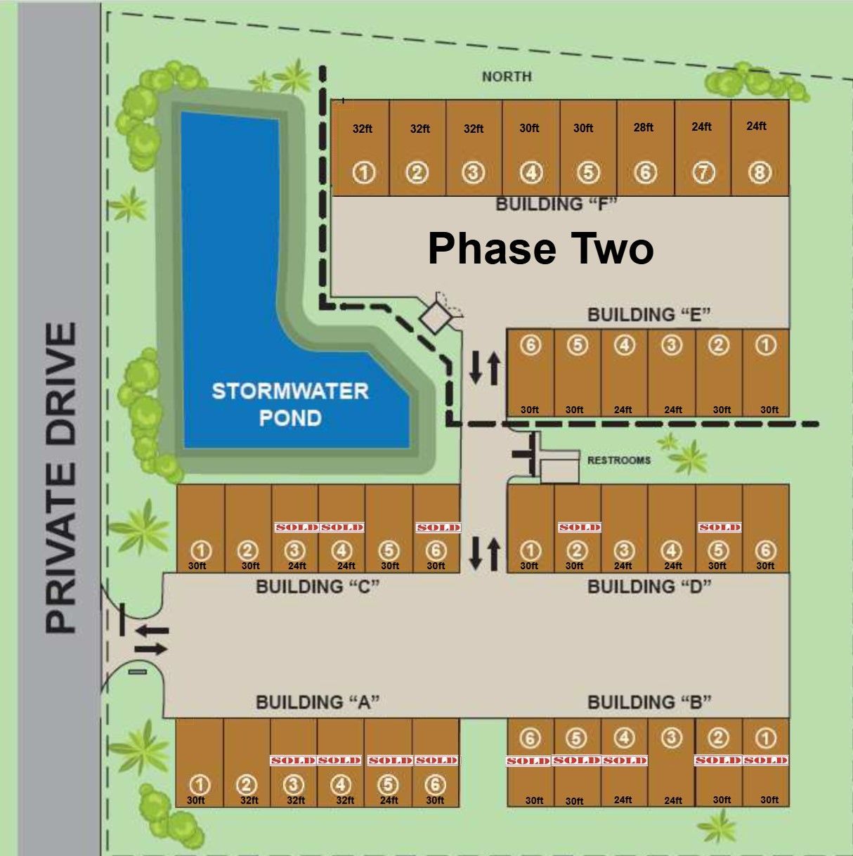 - Unit sizes range from 24’ to 33’ wide, each 52’ deep, offering flexible options for your storage needs