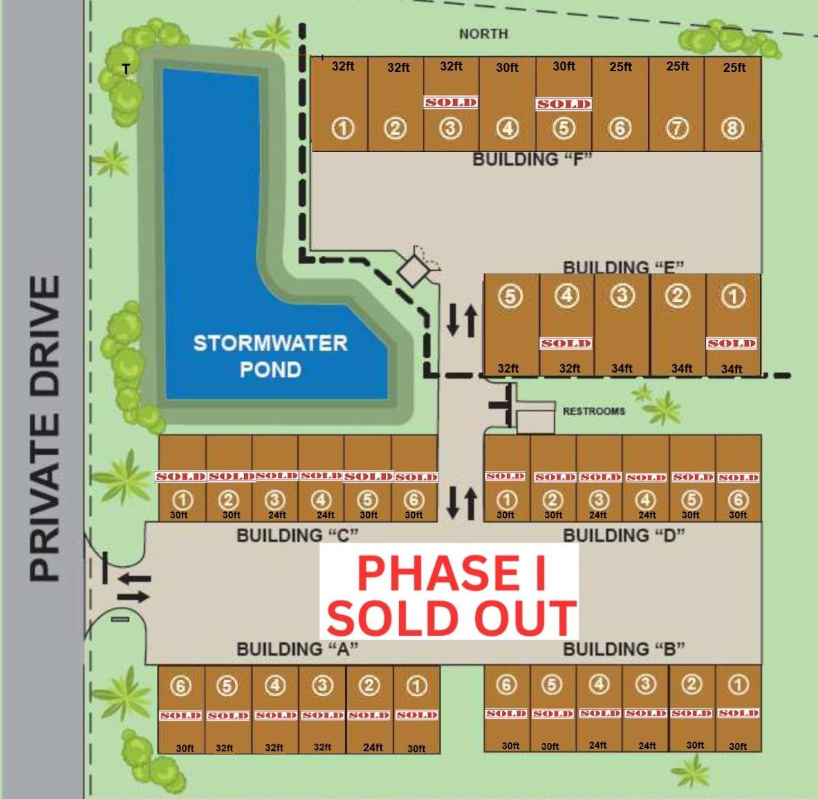 - Unit sizes range from 25’ to 34’ wide, each 52’ deep, offering flexible options for your storage needs