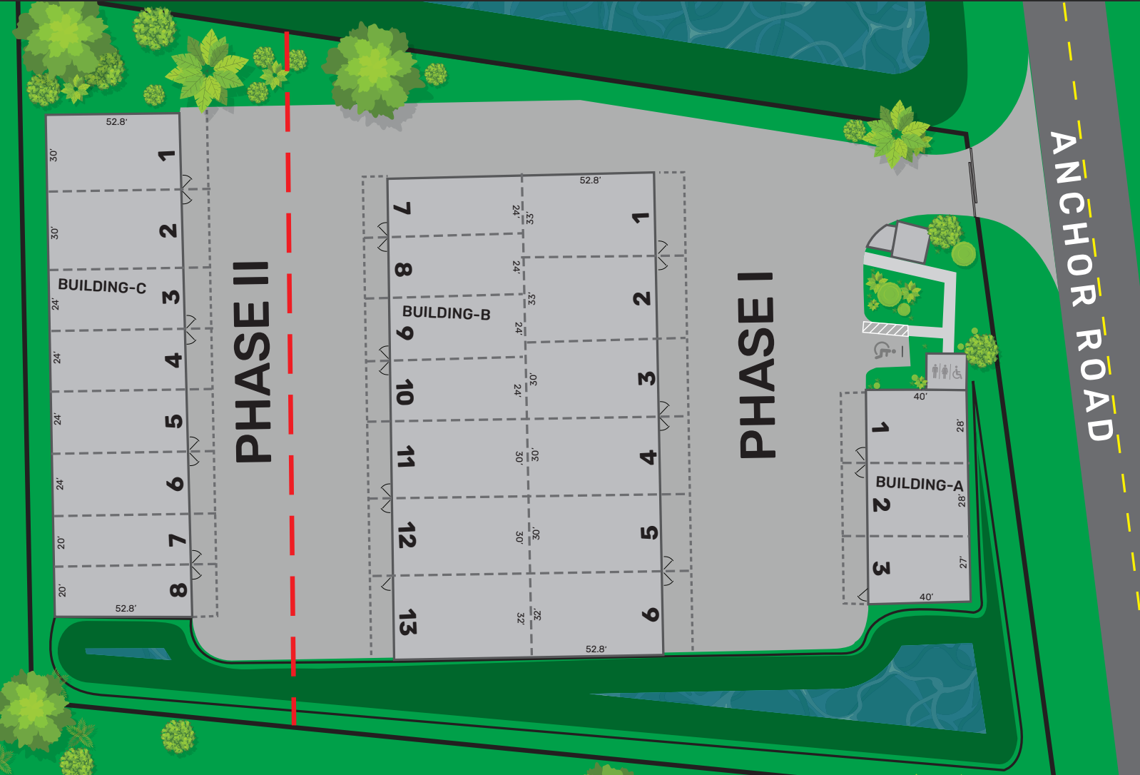 - Unit sizes range from 24’ to 33’ wide, each 52’ deep, offering flexible options for your storage needs